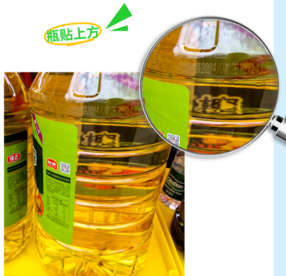 菜籽油系列的生產(chǎn)日期,一般在瓶貼上方和瓶頸處一圈。